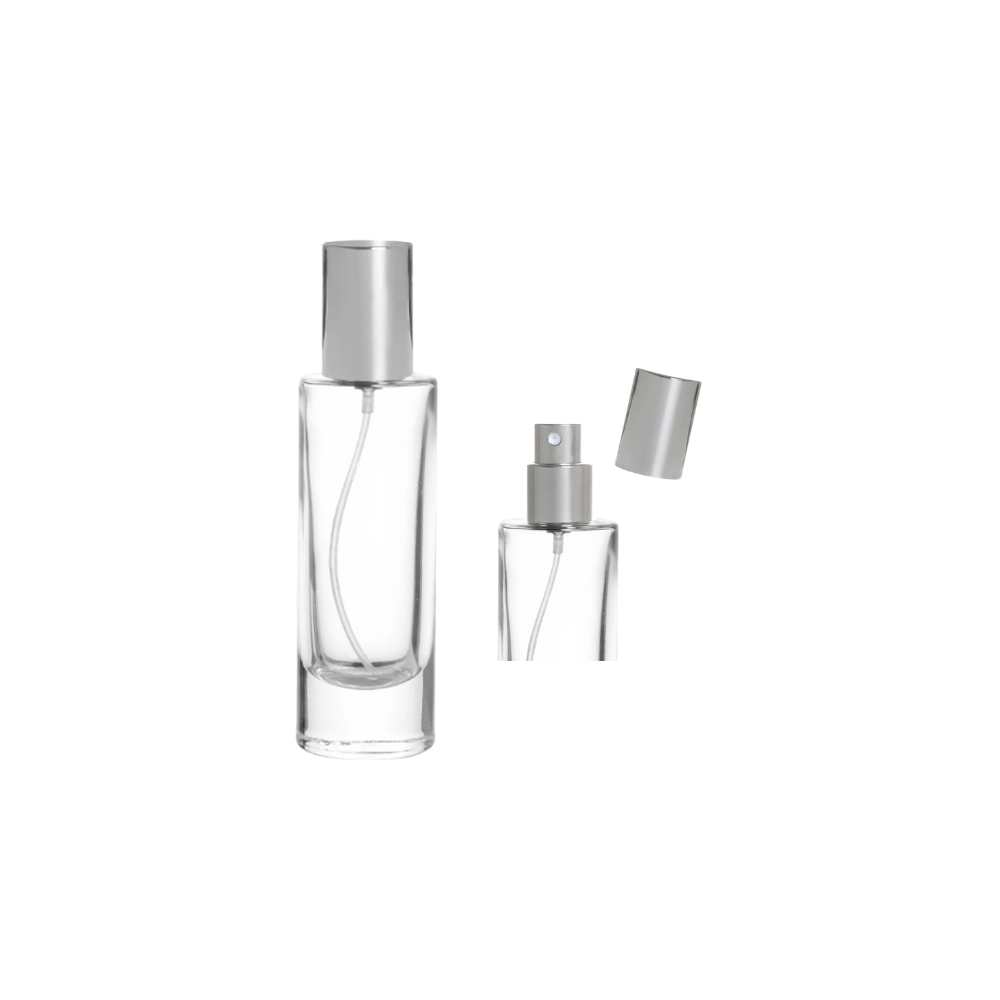 Γυάλινο μπουκάλι 30 ml διάφανο με σπρέι και ασημί καπάκι αλουμινίου