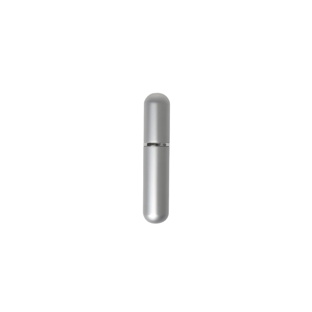 Μπουκαλάκι γυάλινο 5 ml με σπρέι για άρωμα σε ματ θήκη αλουμινίου σε χρώμα ασήμι