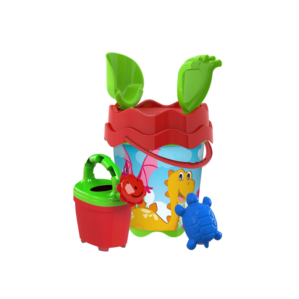 Κουβαδάκι Δεινοσαυράκια με διάμετρο 17cm. Το σετ περιλαμβάνει 6 τεμάχια, ιδανικό για παιχνίδια στην παραλία.