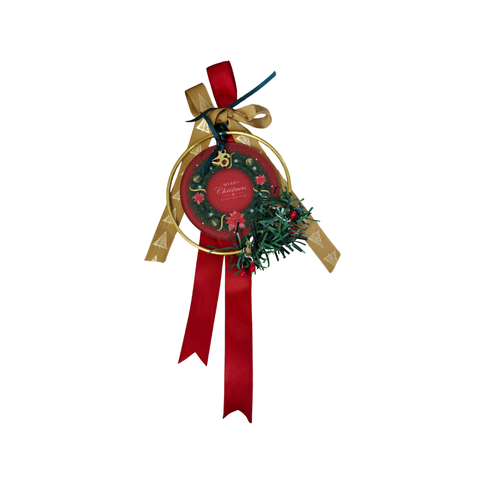 Χειροποίητο χριστουγεννιάτικο γούρι με εντυπωσιακό στεφάνι και τη φράση Merry Christmas, διακοσμημένο με κόκκινες και χρυσές κορδέλες, μεταλλικό κρίκο και γιορτινά στολίδια. Συνδυάζει την κλασική χριστουγεννιάτικη αισθητική με κομψές λεπτομέρειες, δημιουργώντας ένα ζεστό και λαμπερό αποτέλεσμα. Ιδανικό για να στολίσει το σπίτι ή να προσφερθεί ως δώρο, μεταφέροντας ευχές για χαρούμενες γιορτές και καλή χρονιά.