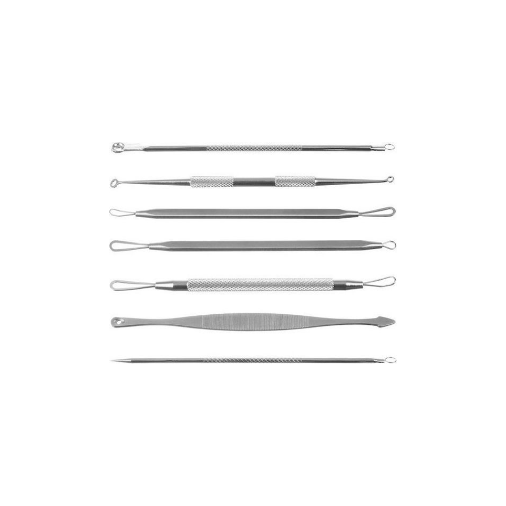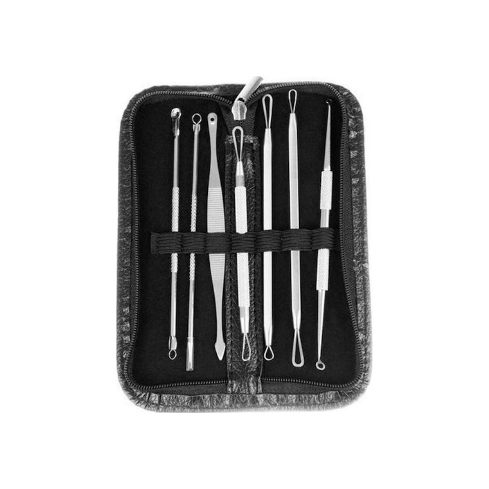 Σετ εργαλείων περιποίησης του δέρματος από ανοξείδωτο ατσάλι. Κατάλληλο για θεραπεία σε σπυράκια, λευκά και μαύρα στίγματα, σκασίματα ακμής και διευρυμένους πόρους. Εξοπλισμένο με τσαντάκι για αποθήκευση, μεταφορά και οργάνωση των εργαλείων.